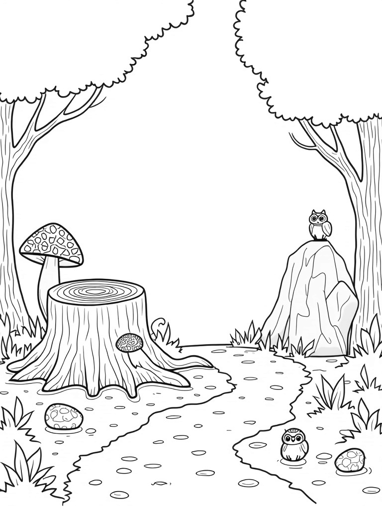 In this magical forest clearing, oversized leaves tower overhead, creating a cozy, enchanted atmosphere. At the center, you’ll find a huge, textured tree stump that looks like the perfect spot for a little creature to take a rest. The stump's rings are filled with intricate patterns just waiting to be brought to life with color!