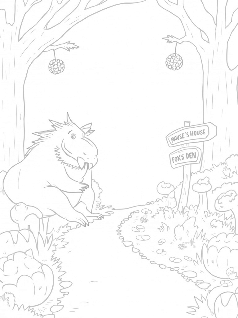 In this enchanting forest clearing, a giant gruffalo with exaggerated features is resting against a tree. Its sharp teeth shine brightly, making it both intimidating and adorable! Surrounding it are oversized mushrooms and twisting vines, creating a magical atmosphere. A patch of colorful mixed berries spills across the ground, inviting little snackers, while a winding pebble path leads to a crooked signpost pointing to 'Mouse's House' and 'Fox's Den'.