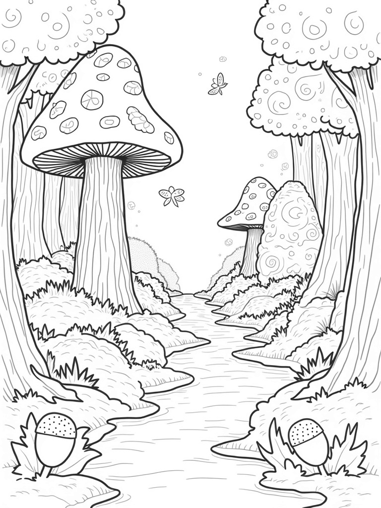 This scene is all about a magical forest filled with towering giant mushrooms that look like they're straight out of a storybook. Their caps are painted in fun swirling patterns that will inspire colorful creativity. Right in the middle, there's a winding path made from oversized acorns that leads to a peaceful clearing. It's like a secret hideaway just waiting to be explored!