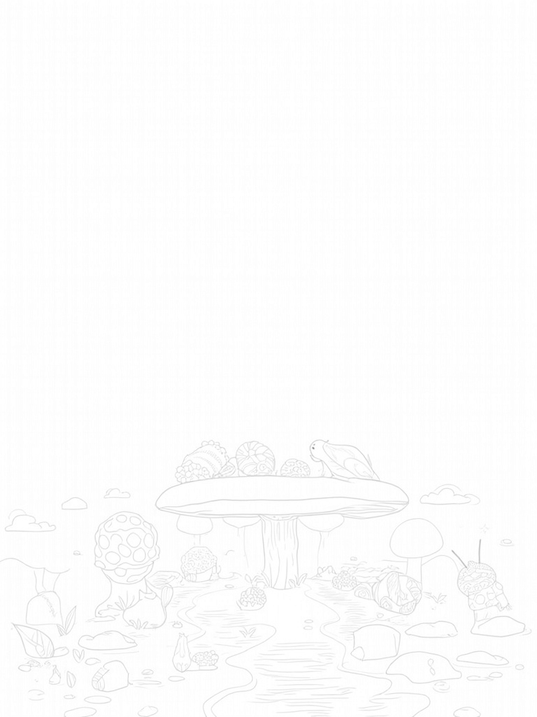 Picture a magical forest clearing where the trees twist and turn like they've got their own personalities. At the center, there's a giant mushroom that looks like the perfect picnic table, surrounded by huge acorns and scattered leaves. If you peek underneath the mushroom, you’ll find some colorful, oversized insects lounging about, each with their own unique patterns. It’s like a little world of wonder!
