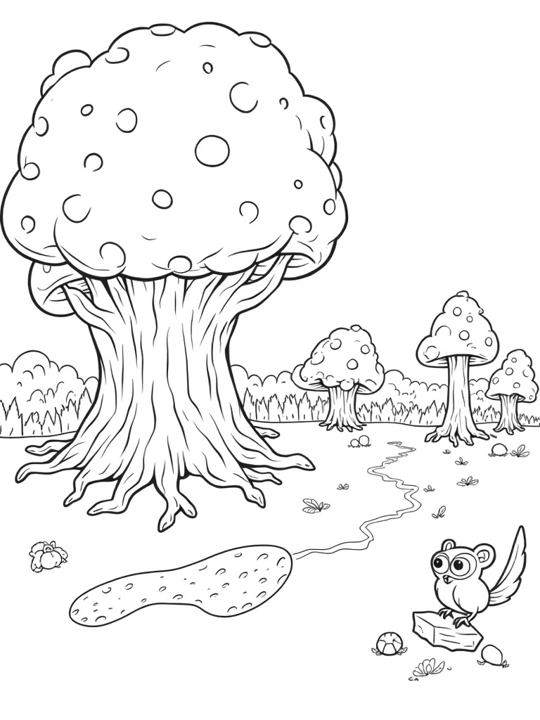 Giant Mushrooms and a Curious Owl in the Forest Coloring Page
