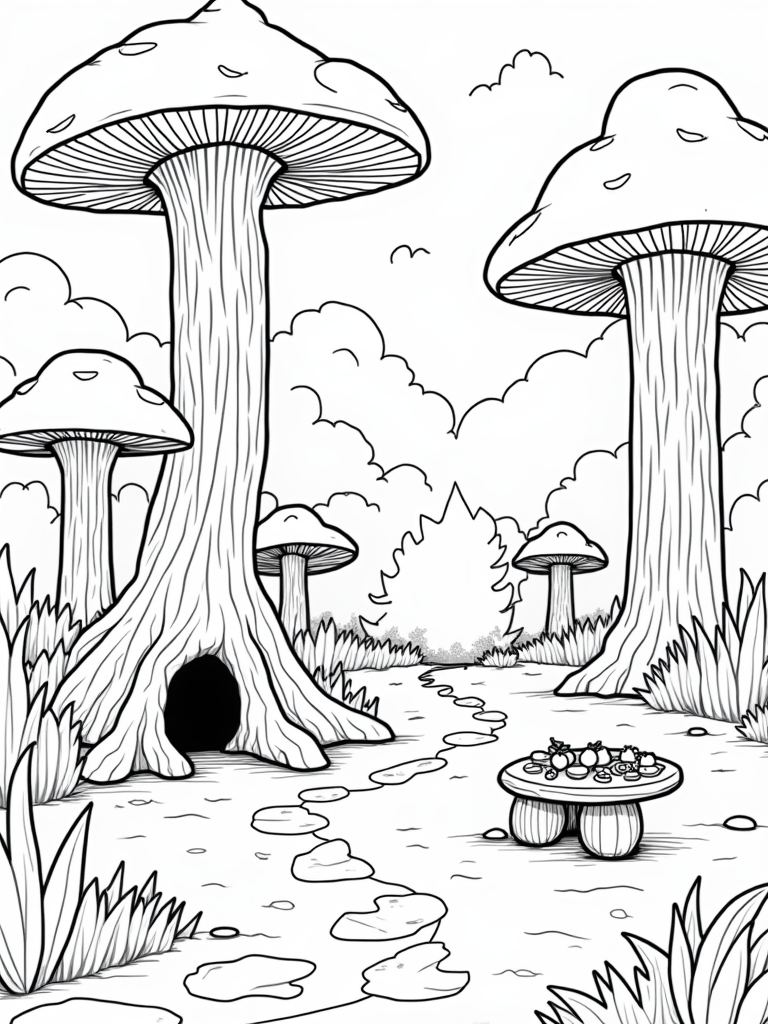 You’ll find a magical forest clearing filled with enormous, colorful mushrooms that look like they could be umbrellas for tiny critters. A winding path made of big, smooth stones leads to a cozy little den tucked beneath the roots of a wise old tree. Just nearby, a giant acorn serves as a picnic table where tiny fruits and playful insects gather for a snack!