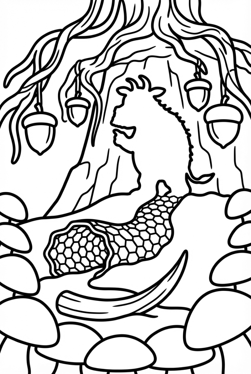 Right in the middle of the picture you’ll see a big stone relief of the Gruffalo’s silhouette carved into a cliff face. It’s bold and easy to trace, perfect for little hands. Around it, twisted roots form arches that hold giant acorn lanterns, and a shallow river snakes across the ground, shaped like a sharp tusk.
