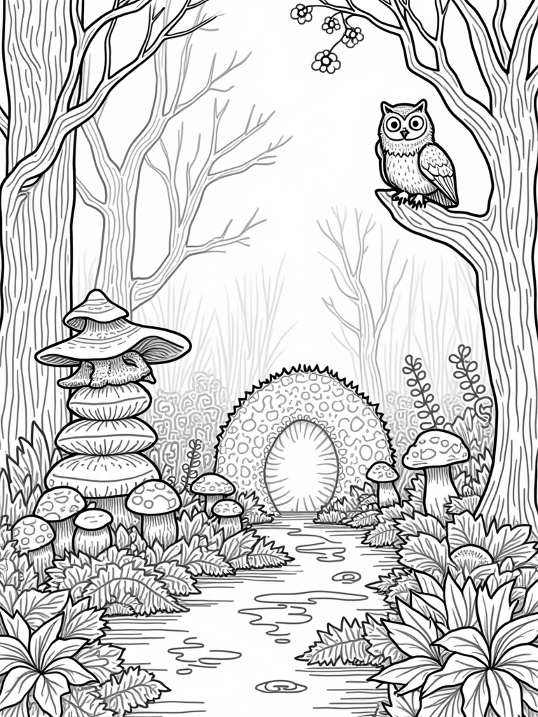 On one side, a spiral tower made of acorns stands tall, inviting you to wonder how many acorns it took to build! And on the other side, a big, friendly owl is perched on a crooked branch, its wings spread wide as if ready to take off. These woodland friends are just waiting for some colorful magic to bring them to life. What colors will you choose for the owl and the mushrooms?