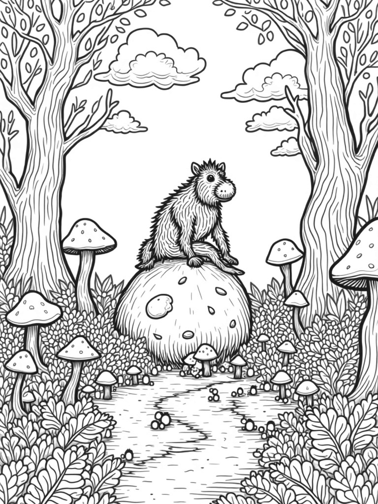 Check out this free, printable coloring page featuring the Gruffalo in a magical forest! With oversized mushrooms and playful woodland creatures, it's a fun way to get creative and relax.
