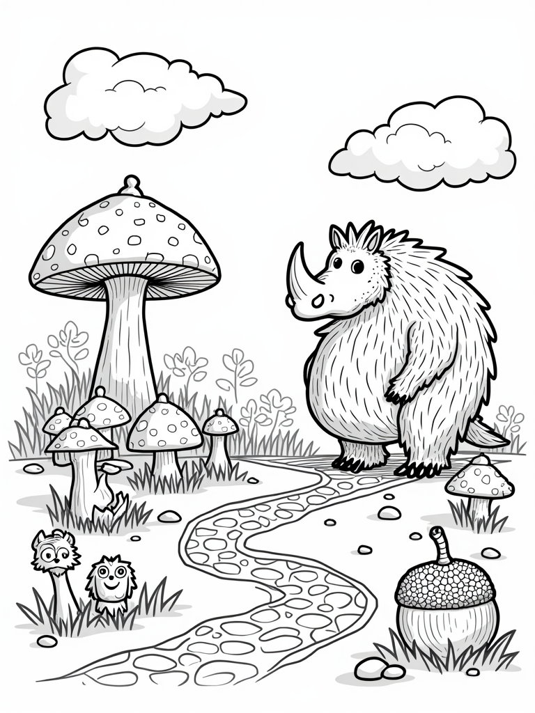 In this enchanting woodland scene, a towering gruffalo stands proudly among giant, colorful mushrooms. Just nearby, a winding path made of vibrant pebbles leads to a giant acorn, complete with swirling patterns that will spark your imagination as you color. Look closely, and you'll spot a wise owl keeping an eye on everything from a branch, while a curious fox peeks out from behind a bush, adding to the playful atmosphere.