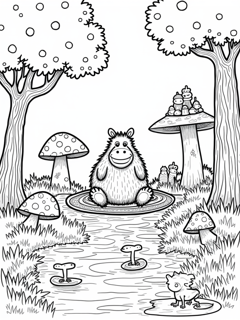 Check out this free, printable coloring page featuring a gruffalo in a whimsical forest clearing. With oversized mushrooms, happy birds, and playful frogs, it’s a fun scene for kids to color and enjoy!