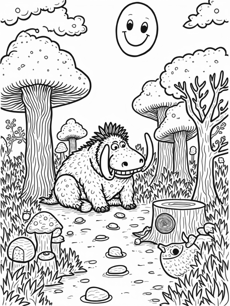 Gruffalo in a Whimsical Forest with Oversized Mushrooms Coloring Page