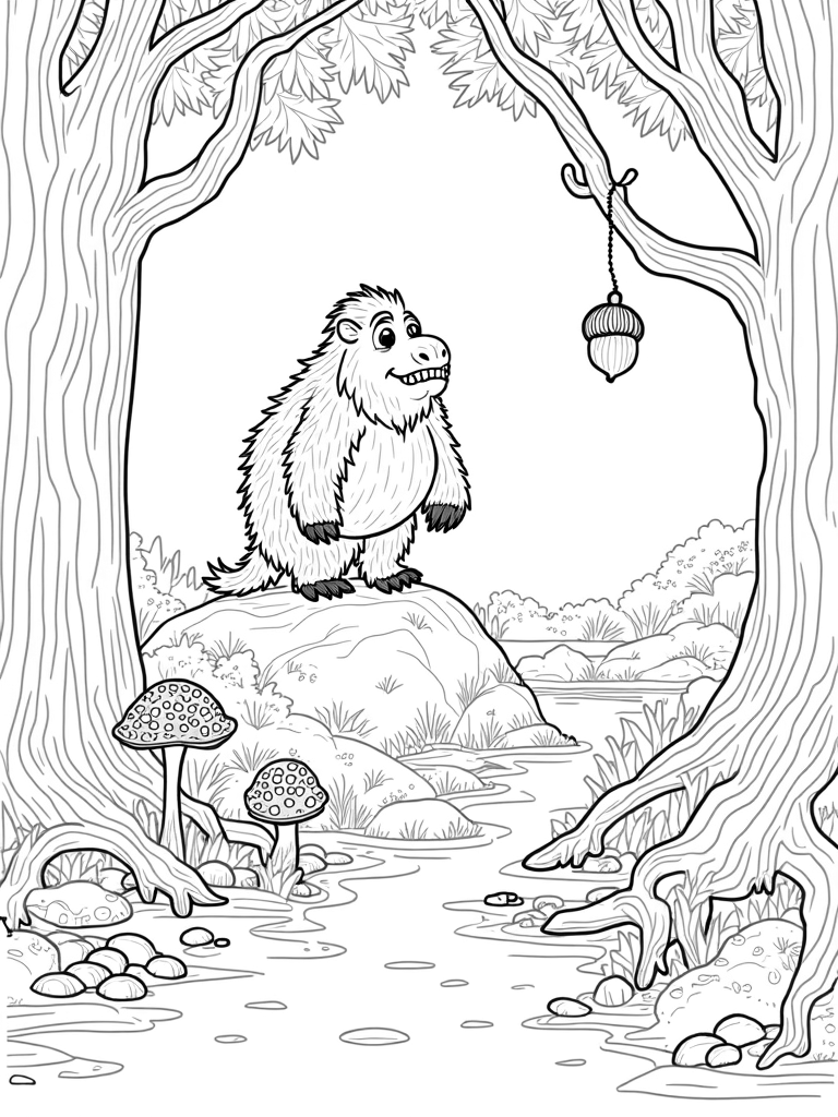 Surrounding our friendly gruffalo are vibrant mushrooms sprouting in all sorts of shapes and sizes. They add a splash of color to the earthy tones of the forest floor. Not far away, a winding river flows gently, with oversized pebbles that resemble animal footprints, hinting at the creatures that might pass by. And don’t miss the large acorn hanging from a branch above—it's like a little treasure waiting to be discovered!
