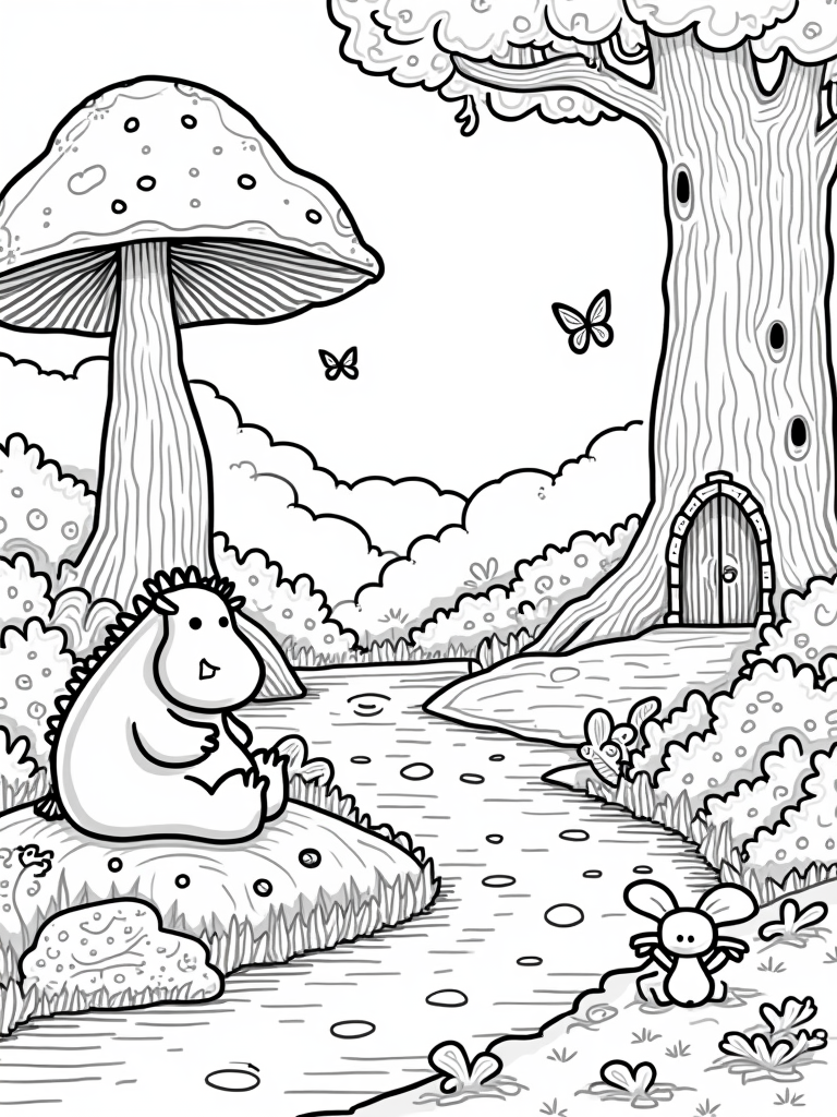 Colorful butterflies flutter around, adding splashes of color to the scene. A gentle stream winds through the clearing, dotted with smooth pebbles that kids can imagine skipping stones across. It's a perfect spot for creativity, where little ones can bring this whimsical forest to life with their favorite colors.