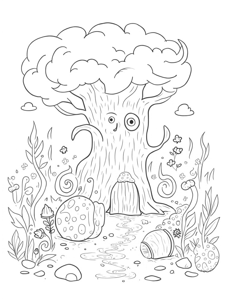 Gruffalo Tree in a Whimsical Forest Glade Coloring Page