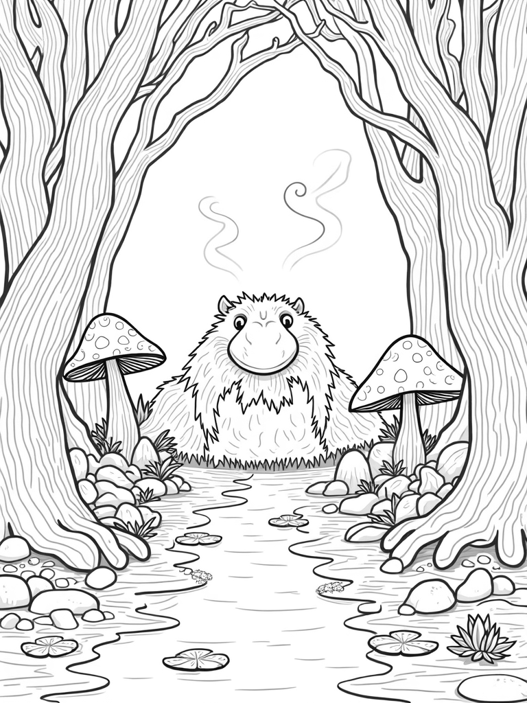 A winding pebble path leads you to a serene pond, where lily pads float lazily, each one showcasing its own unique design. Look closely, and you might even spot playful swirls of smoke drifting from a hidden cave in the background, adding a hint of mystery to this enchanting scene. It’s a place where creativity can run wild!