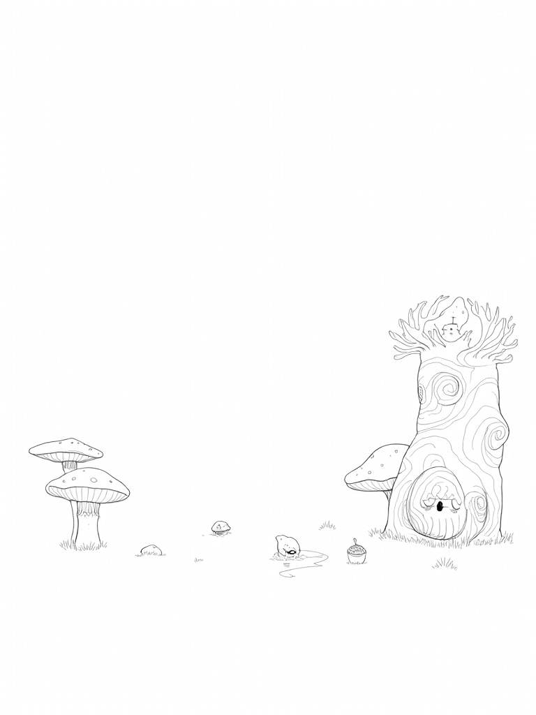 Look closely, and you’ll see large acorns scattered at the base of the rock, along with curious footprints that lead off into the underbrush. Who could have made them? Maybe there are unseen creatures living nearby, just waiting for you to color them in! And don’t forget the winding pebble path that leads to a whimsical treehouse nestled high among the branches. It’s the perfect spot for imaginative play!