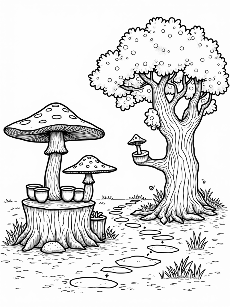 Mushroom Wonderland with a Tree Stump Table Coloring Page