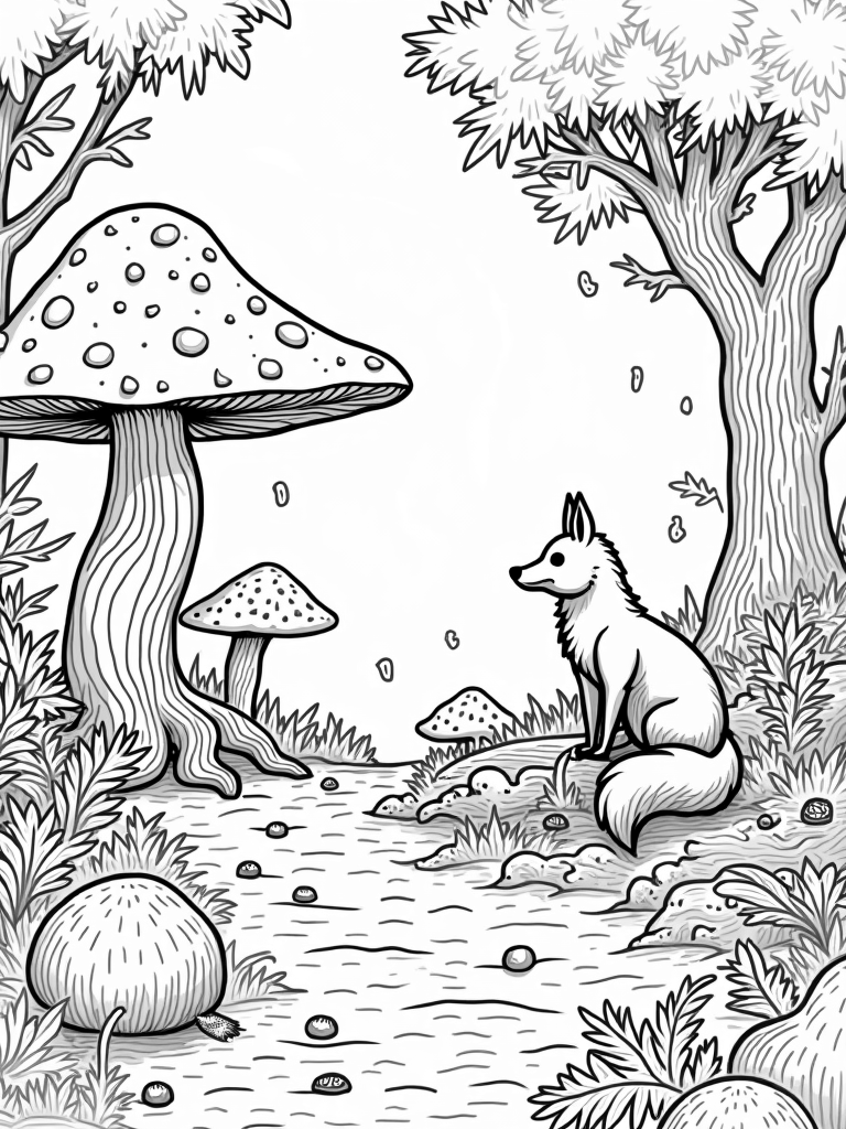 Oversized Mushrooms and a Fox in the Forest Glade Coloring Page