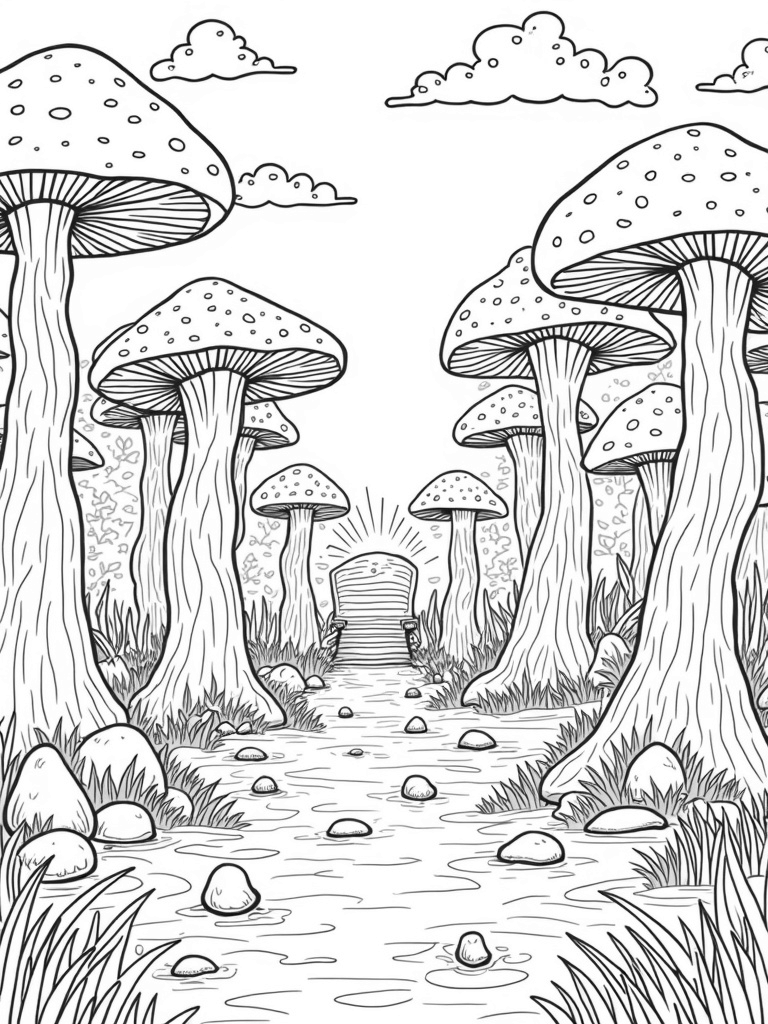 Oversized Mushrooms and a Magical Forest Path Coloring Page