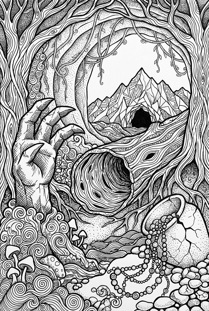 Try using warm oranges for the amber beads and cool blues or greens for the vines to make them pop against the dark bark. The stone claw can be a mix of greys with a touch of purple for depth, while the mushrooms are perfect for bright reds or soft yellows. Have fun mixing textures – cross‑hatching for bark, swirls for the vines, and dot work for the beads.