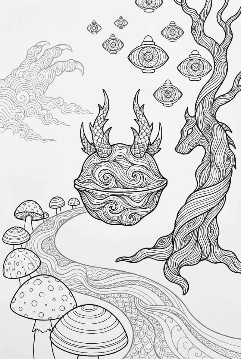 Because the line work is all clean zentangle patterns, you can pick any colors you like—maybe give the walnut a warm brown, the horns a cool blue, or go wild with rainbow mushrooms. The empty spaces are perfect for adding your own doodles or little critters. Grab your crayons, markers, or colored pencils and let the scene come alive.