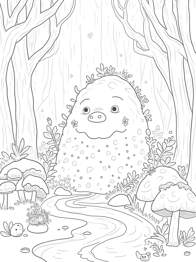 Whimsical Forest with a Gruffalo Rock Coloring Page