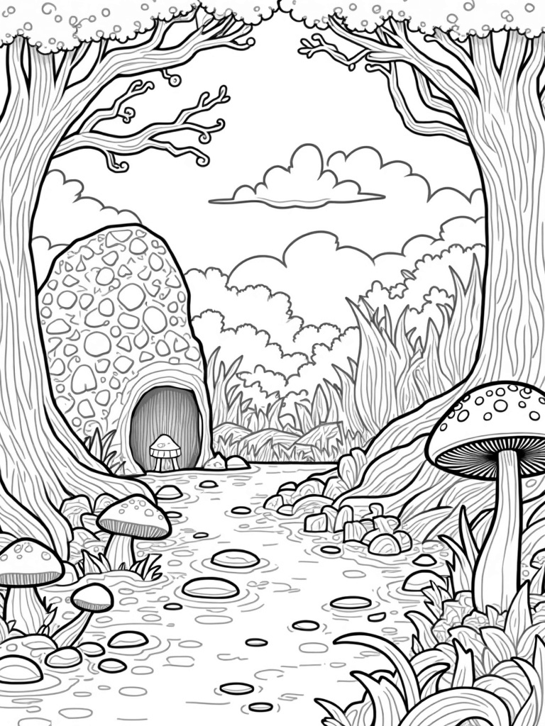 As you color this enchanting forest, don’t miss the winding pebble path that leads to a cozy den made from tangled roots and lush ferns. It looks like the perfect spot for a woodland creature to nap or play hide and seek! And let’s not forget the clouds above, playfully shaped like different animals, adding a touch of whimsy to your artwork.