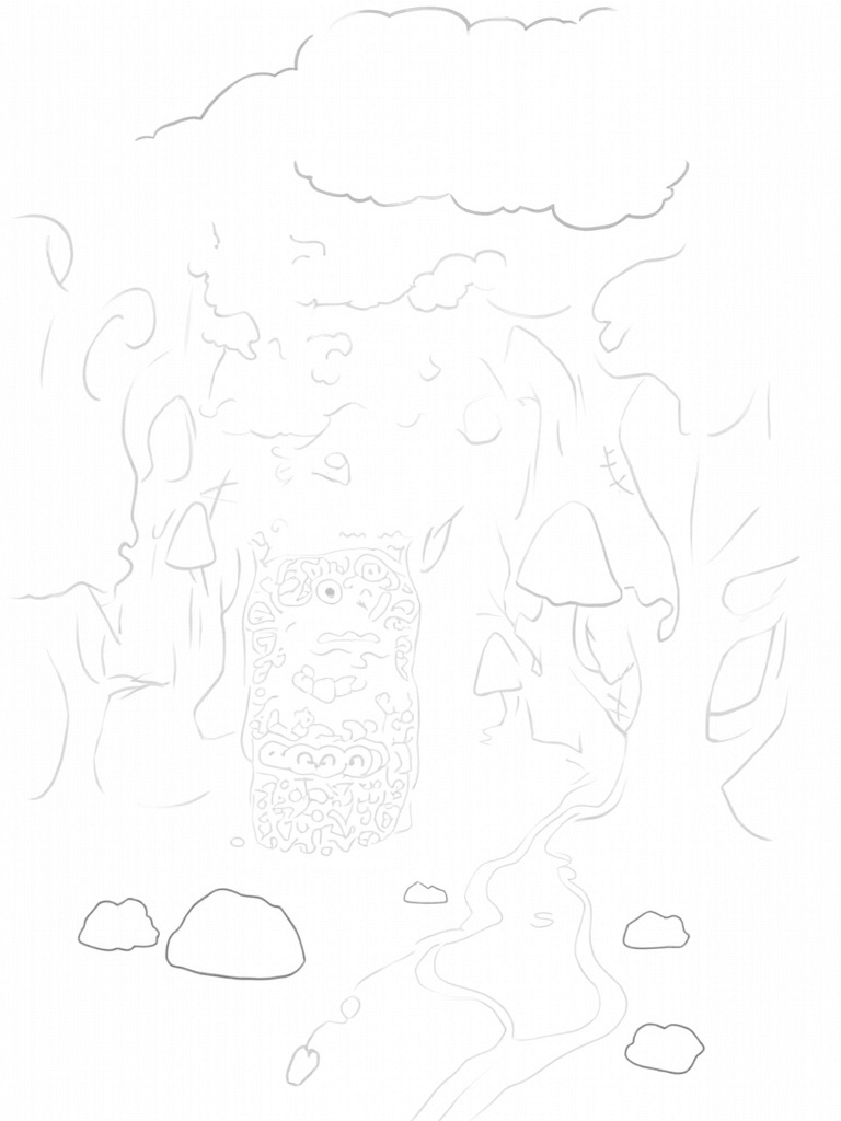 This scene is all about a magical forest filled with oversized mushrooms and twisted trees. At the heart of it, there's a big, gruffalo-shaped rock that looks like it's been there forever, covered in fun, swirling patterns of vines and leaves. Nearby, a winding path made of smooth stones leads you to some curious, cartoonish eyes peeking out from behind a bush. And don't forget to look up at the sky, where fluffy, exaggerated clouds float by, casting playful shadows on the forest floor.