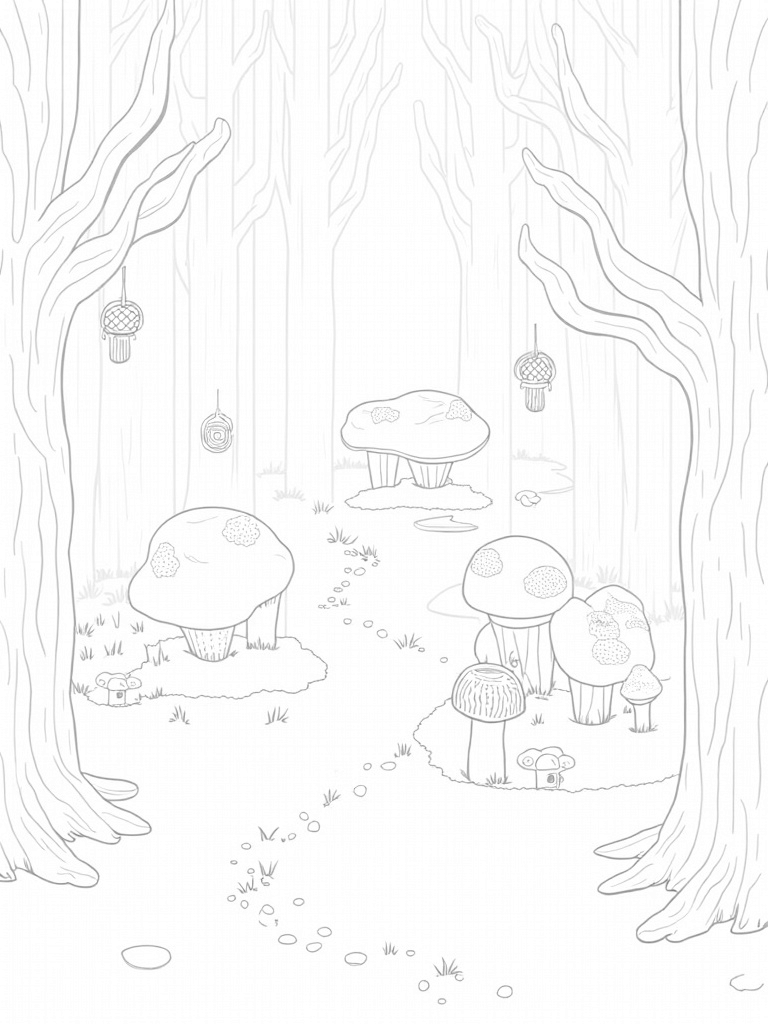 This coloring page invites little artists to bring the scene to life. You can follow the winding path of pebbles that leads to a clearing filled with oversized acorns—each one shaped like a tiny house! Just imagine what kind of creatures might live in there. Don't forget to add some color to the lanterns hanging from the branches, glowing softly and casting fun shadows on the forest floor. Let your imagination run wild!