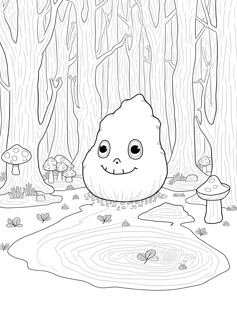 Whimsical Forest with Gruffalo's Face and Fun Mushrooms Coloring Page