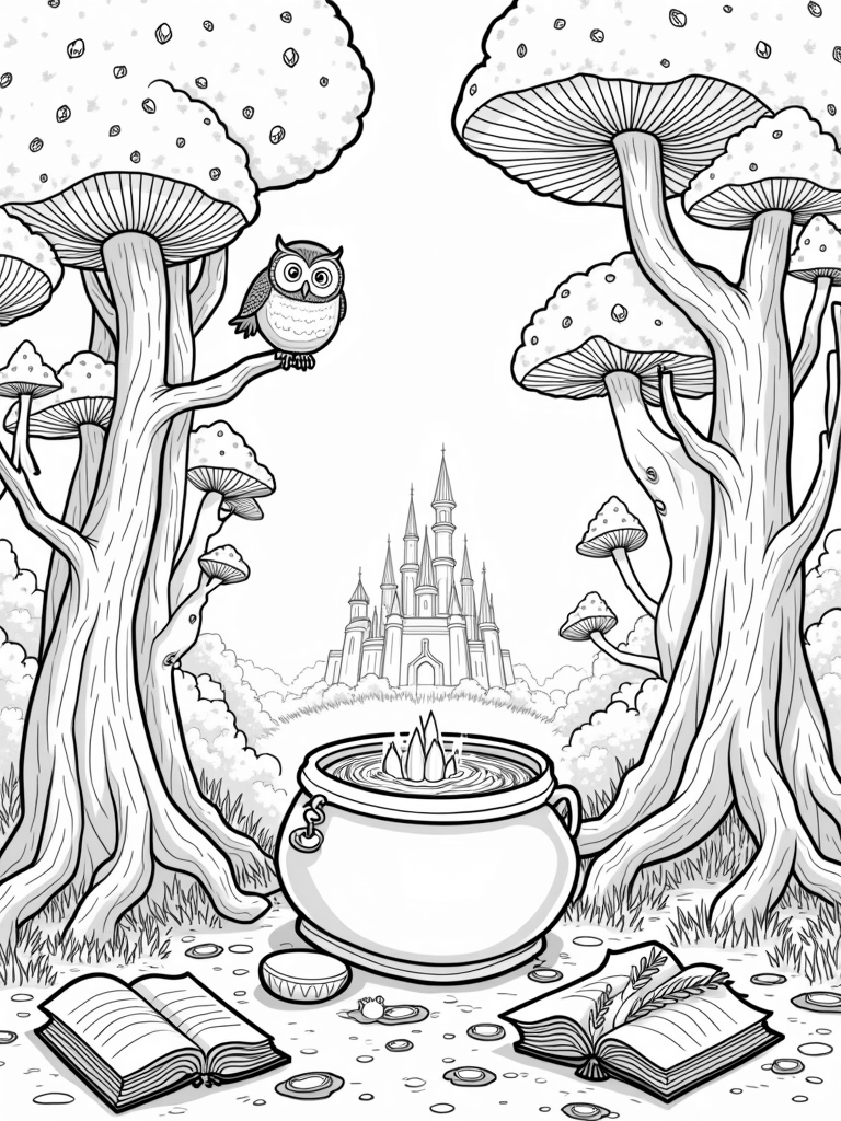 Enchanted Forest with Mushroom Magic and Mystical Owls Coloring Page