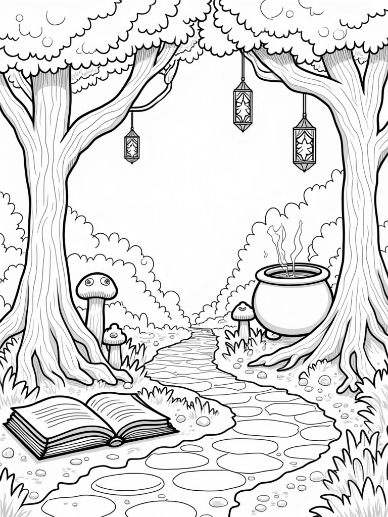 Enchanted Forest with Twisted Trees and a Spellbook Coloring Page