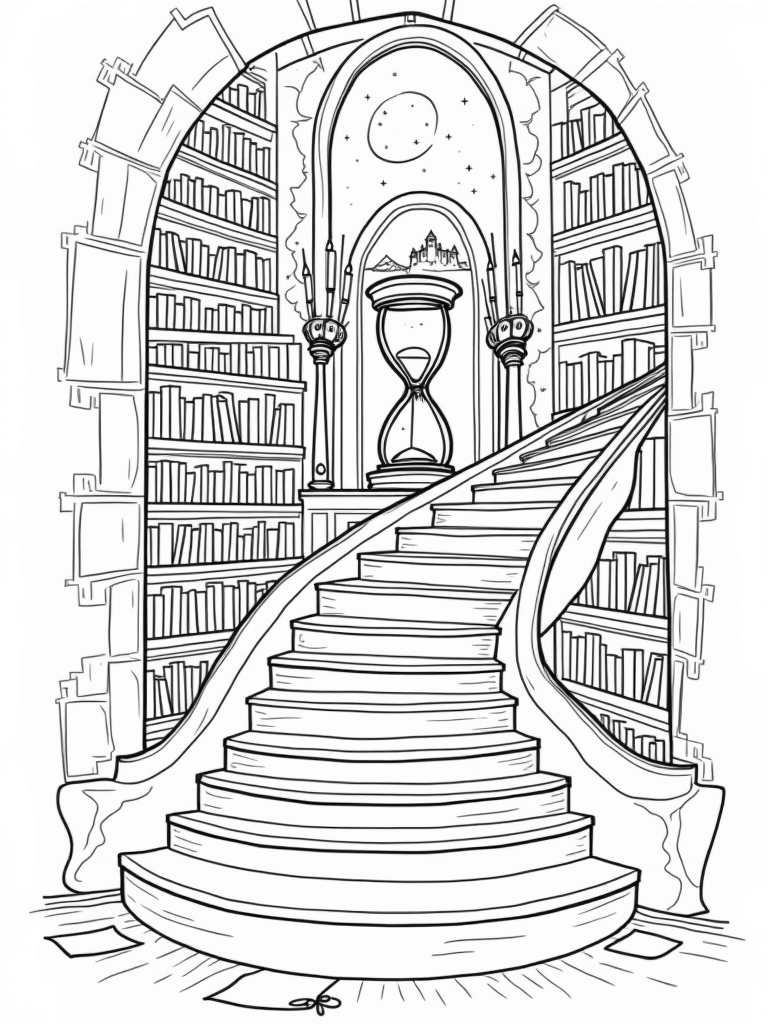 Enchanted Library Staircase with Floating Candles Coloring Page