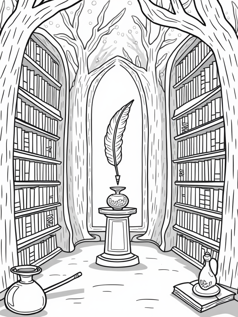 This scene is straight out of a magical storybook! Picture towering bookshelves shaped like ancient trees, each filled with colorful spellbooks that seem to float above the ground. Their pages flutter like leaves in the wind, adding to the enchanting atmosphere. A giant quill pen, resembling a feathered serpent, curls around a sparkling inkwell, making you wonder what magical tales are waiting to be written.