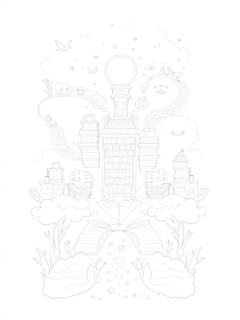 Look closely! There's a giant inkwell spilling shimmering ink that flows into a beautiful river of parchment below. You might even spot quill pens floating by like little boats! Above, a crescent moon casts a gentle glow on colorful potion bottles that hover mid-air. Each potion is filled with vibrant colors, perfect for adding your personal touch.