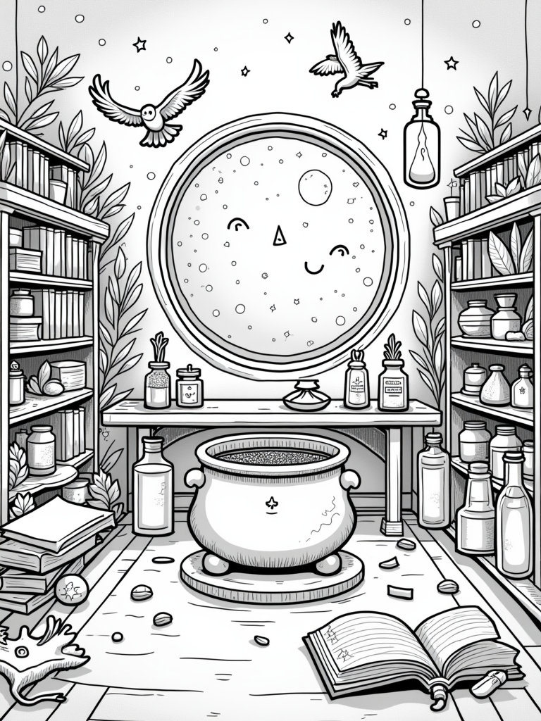 This magical scene is set in a wizarding classroom that’s bursting with creativity! Floating books and enchanted quills dance in the air, making it look like something straight out of a storybook. In the center, a big cauldron bubbles with colorful potions, while vibrant herbs and sparkling crystals fill the shelves around it.