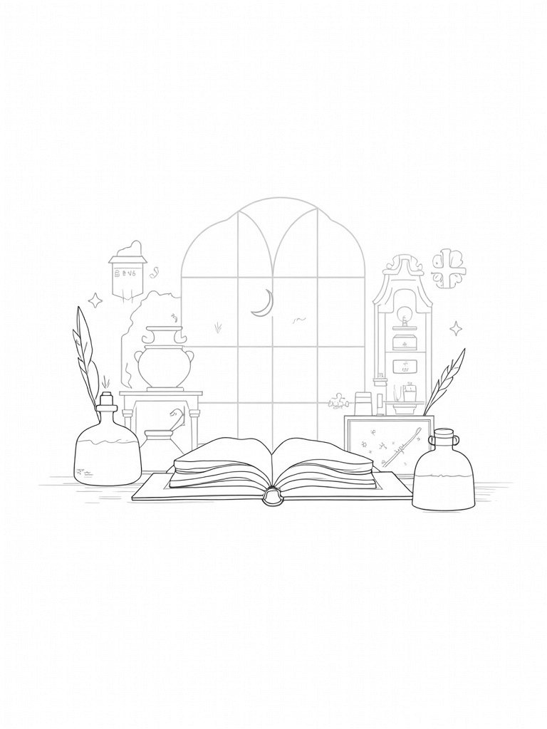 Enchanted Wizarding Workshop with Potion Bottles and Spellbook Coloring Page