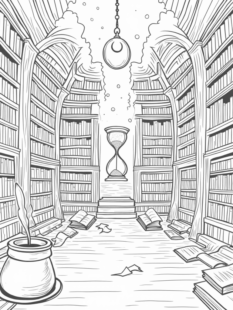 This magical library is filled with towering bookshelves that seem to reach for the shadows above. Each shelf is packed with glowing spellbooks that float gently, while some are open, showcasing their shimmering pages. The centerpiece is a giant hourglass, filled with sparkling sand that ticks away time, surrounded by an oversized quill resting in a cauldron-shaped inkpot. Scattered parchment scrolls are unfurled like gentle waves, adding to the enchanting scene.