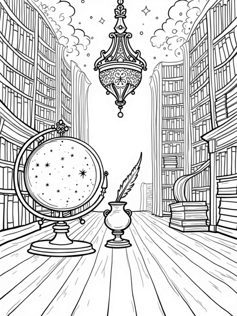 Check out this free, printable coloring page of an enchanting wizarding library! Perfect for fans of Harry Potter, it features floating tomes and a giant quill. Let your creativity shine as you color in this magical scene.