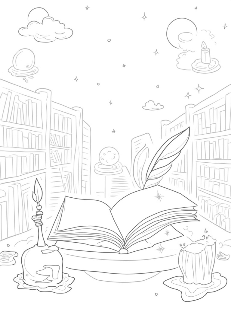 Floating Books and Enchanted Candles in a Magical Library Coloring Page