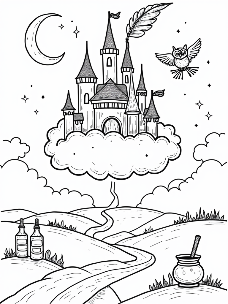 Floating Castle with Book Towers and a Magical Owl Coloring Page