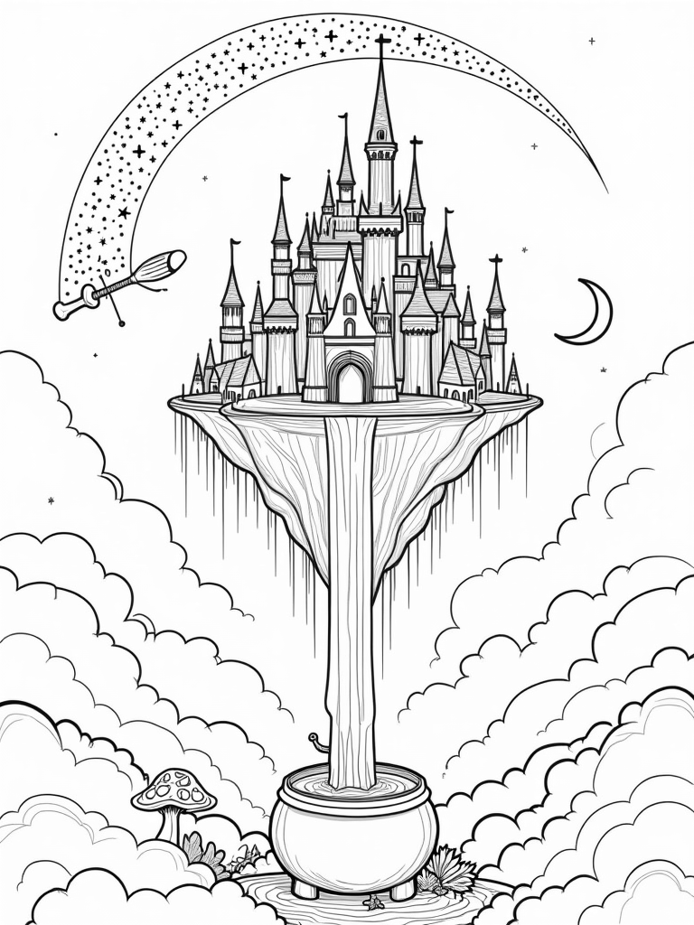 Floating Castle with Spellbooks and Bubbly Cauldron Coloring Page