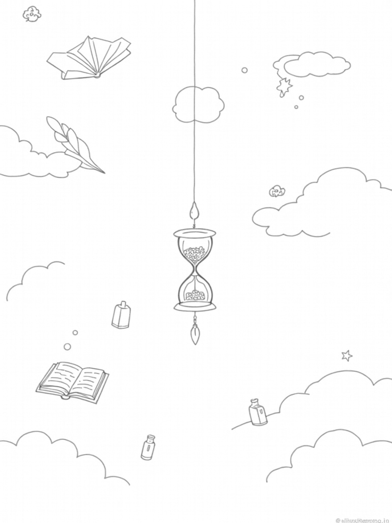 This scene is straight out of a dream! Imagine a library where ancient books float among fluffy clouds, and glowing quills are scribbling magical words in the air. At the center, there's a giant hourglass filled with shimmering stardust, casting beautiful shadows all around. It feels like a place where anything is possible!