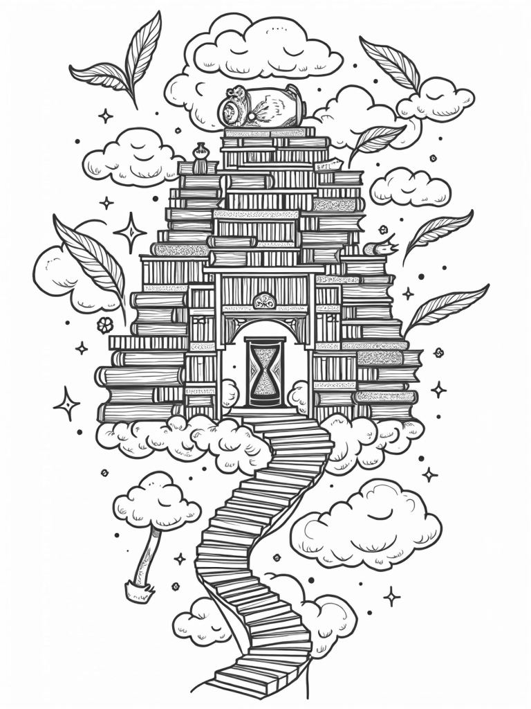 Floating Library with Ancient Books and Enchanted Quills Coloring Page