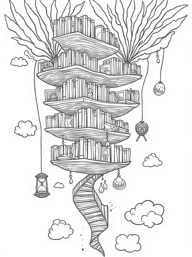 Imagine a library that's not just on the ground but floating high up in the clouds! This unique coloring page shows spiral bookshelves reaching into the sky, filled with spellbooks just waiting to be colored. Above each shelf, giant quills hover, casting playful shadows that dance on the pages below, sparking your creativity.
