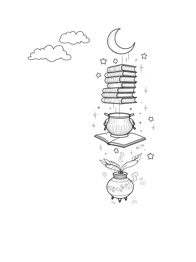 Floating Library with Enchanted Cauldron and Moonlit Magic Coloring Page