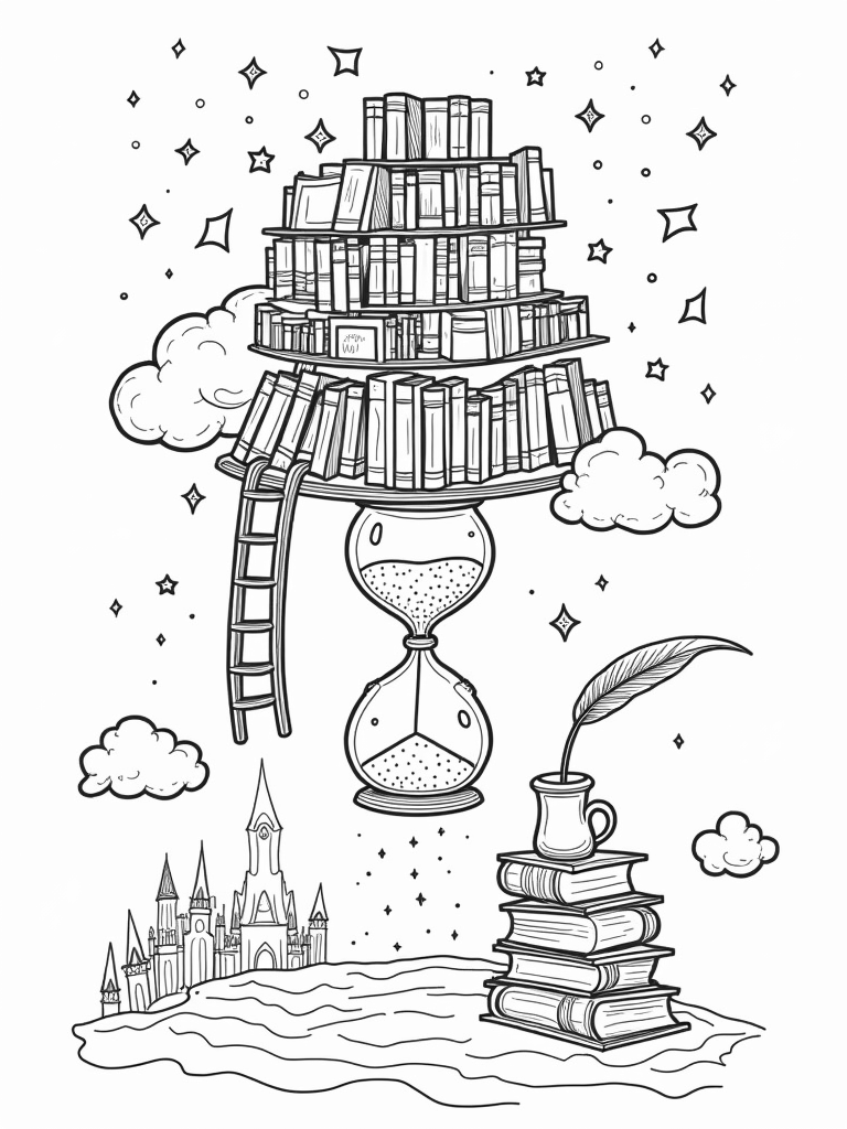 Floating Library with Hourglass and Moonlit Tomes Coloring Page