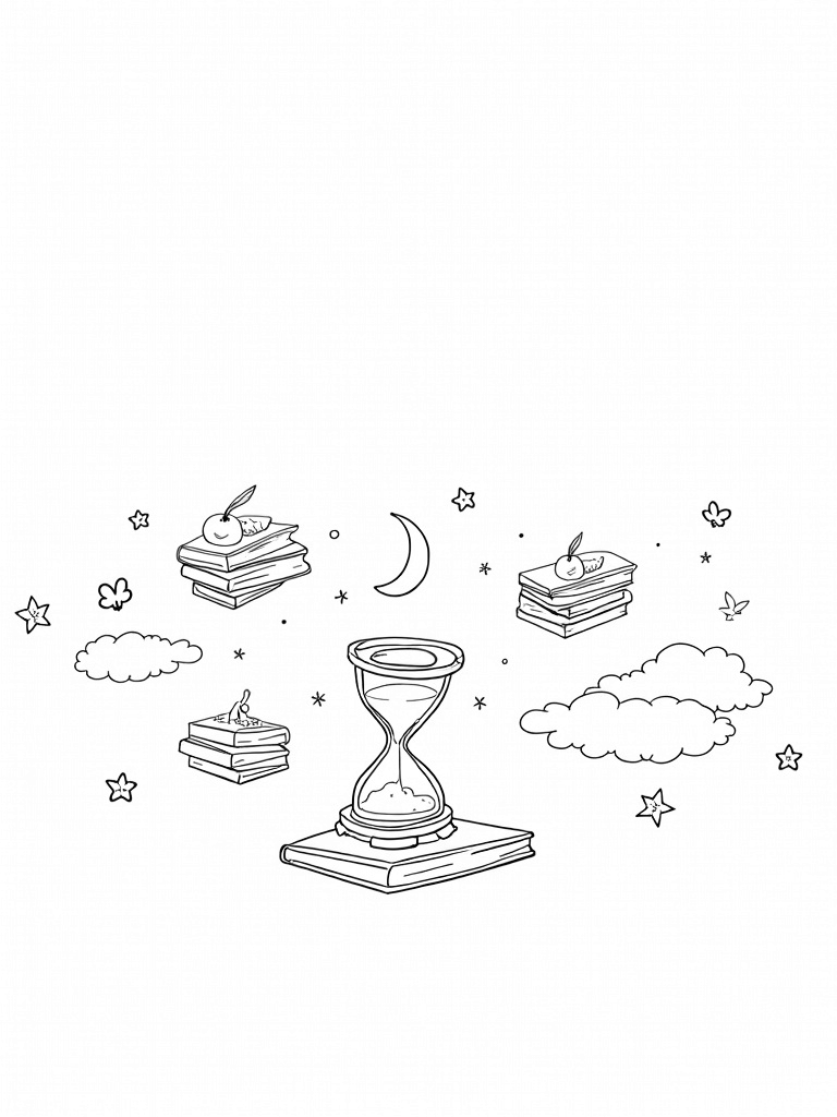 Imagine a library that's not just on the ground but floating in the sky! Towering bookshelves hang out among fluffy clouds, and magical books with glowing pages flutter around like butterflies. Quills and ink pots join the party, hovering in formation. Right in the center, there's a big, ornate hourglass with shimmering sand flowing upwards toward a crescent moon. It's like something straight out of a dream!