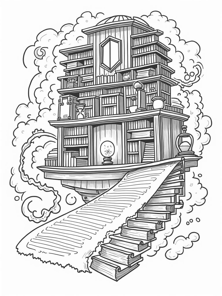 Floating Library with Potion Recipes and Enchanted Quills Coloring Page