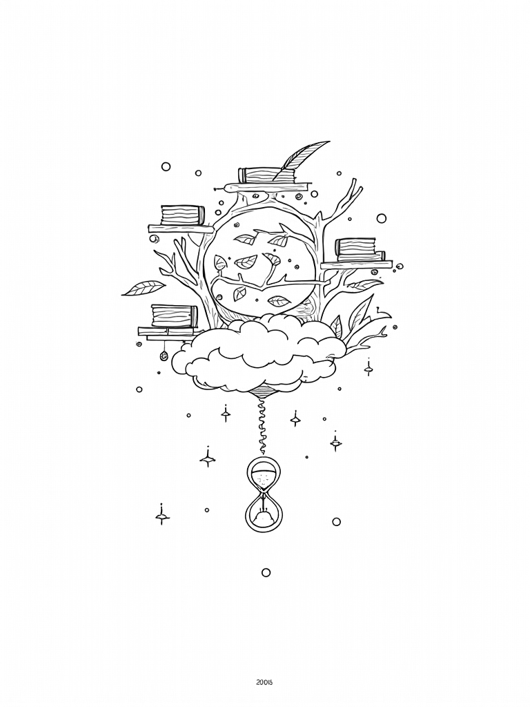 Look closely, and you'll notice a large, ornate hourglass filled with shimmering sand, sitting right at the edge of this whimsical library. It’s like time itself is taking a moment to enjoy the magic happening around it! Each detail in this illustration invites you to grab your favorite colors and make this dreamy library come to life.
