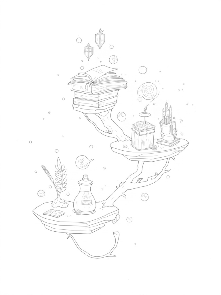Floating Wizarding Library with Enchanted Tome Coloring Page