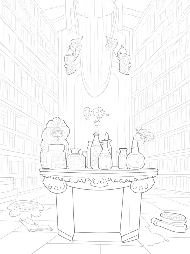 Check out this free, printable coloring page featuring a magical library filled with glowing books, bubbling potions, and a watchful owl. Perfect for kids who love Harry Potter and imaginative scenes, it's great for sparking creativity during coloring time!