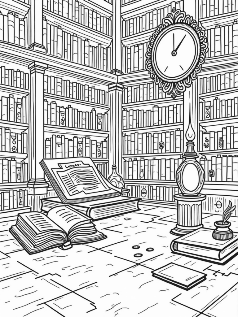 Imagine stepping into a library where the shelves are filled with spellbooks and colorful potion vials. There’s a giant book propped open on a pedestal, its pages swirling with enchanting illustrations of spells. Floating candles dance in the air, casting a warm glow all around. If you look closely, you’ll see a clock with gears that actually move, ticking softly in the corner. A polished wooden table holds a quill and inkpot, surrounded by scattered parchment just waiting to be filled with your own magical ideas.